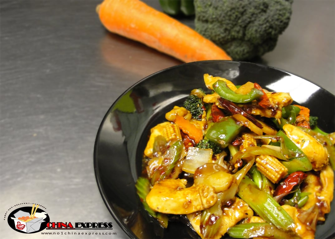Celery, Onion, Baby Corn, Water Chestnut, Broccoli, and Mushroom stir-fried with sliced chicken breast in spicy sweet Szechuan sauce.